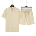 The short-sleeve shirt features a modern mandarin collar and single-breasted closure, bringing a sleek and contemporary look, while the drawstring shorts ensure practicality and freedom of movement.